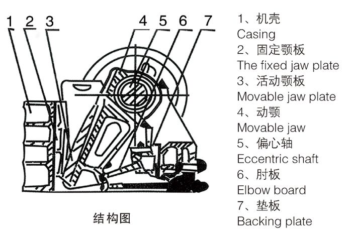 該系列破碎機(jī)工作方式為曲動(dòng)擠壓型,其工作原理是:電動(dòng)機(jī)驅(qū)動(dòng)皮帶和皮帶輪,通過(guò)偏心軸使動(dòng)顎上下運(yùn)動(dòng),當(dāng)動(dòng)顎上升時(shí)肘板與動(dòng)顎間夾角變大,從而推動(dòng)動(dòng)顎板向固定顎板接近,與其同時(shí)物料被壓碎或劈碎,達(dá)到破碎的目的;當(dāng)動(dòng)顎下行時(shí),肘板與動(dòng)顎夾角變小,動(dòng)顎板在拉桿,彈簧的作用下,離開固定顎板,此時(shí)已破碎物料從破碎腔下口排出。隨著電動(dòng)機(jī)連續(xù)轉(zhuǎn)動(dòng)而破碎機(jī)動(dòng)顎作周期運(yùn)動(dòng)壓碎和排泄物料,實(shí)現(xiàn)批量生產(chǎn)。